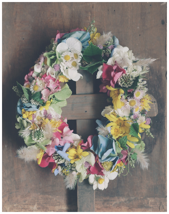 生花の紫陽花と野の草花をつかって手で編む花環づくり。