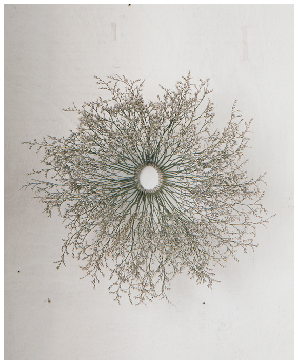 自ら採集した数百のナズナやエノコログサなどを乾燥させ、命を内包するかのように編んで作られた花環。