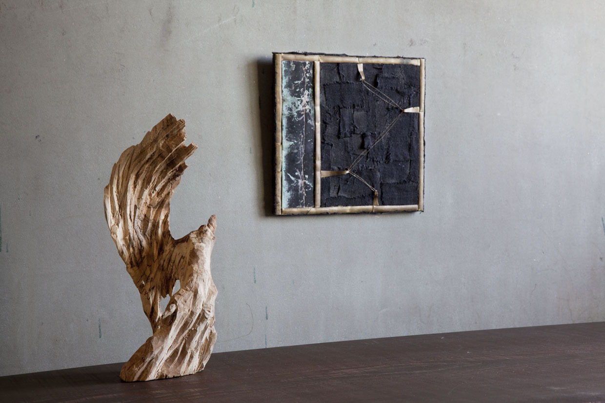 「物事の始まりは、全てのものにある。」 田代裕基は、それを想像することで生まれるエナジーを糧に創作しているように思います。今回は彫刻作品に加え、木塊や古布、錆びた金属などの時を重ね磨かれた素材を組合せ、コラージュした平面作品も展示されます。