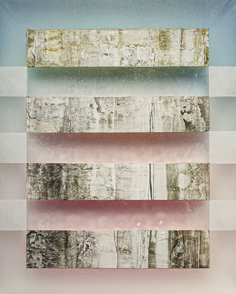 作品を描く時に思い出すふたつの感覚があります。ひとつは幼い頃に夜の海で泳いだ記憶です。夜になると空も海も判別できなくなり、闇しか無い恐怖のなかで、海面を意識しながら泳いだ時の感覚が、今の制作のテーマである平面性と物質の関わり方を創り出したのではないかと感じています。もうひとつは私が32歳の春、父が亡くなり荼毘に付され、白い煙となって空へ上っていくのを見送った時のことです。昔から形のないものを描きたいと思っていた私は父のその姿をみて雲のような大気のような存在を描きたかったのだと気が付き、難しいけれど今もそう思っています。