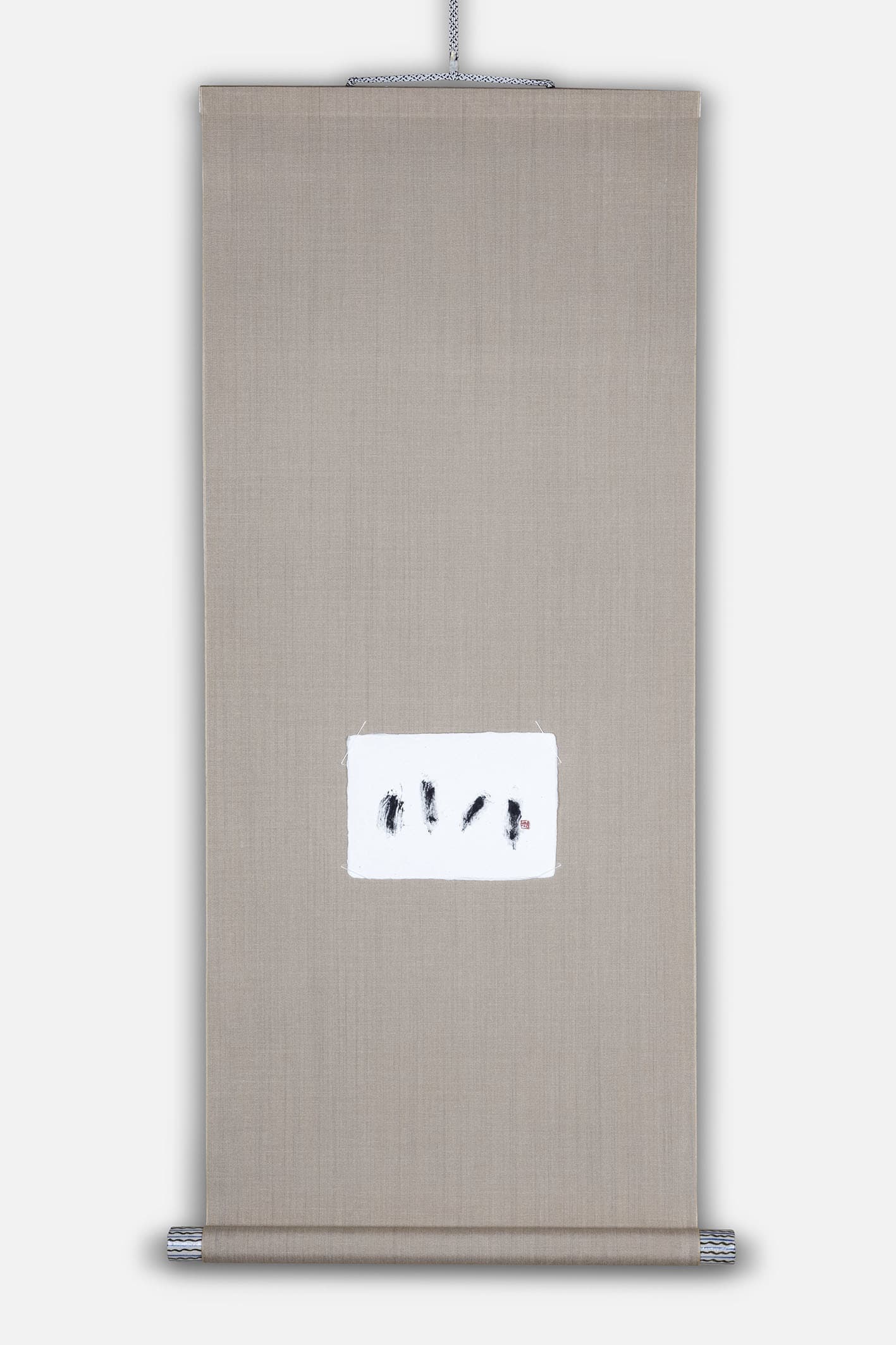 書道という制約から離れ「書」を抽象化して描くことで川口茜漣は画家としてもキャリアを重ねてきました。墨の魅力を彼女にたずねると、硯や紙との相性で多様に変化する捉えどころのない奥深さだと言います。描き始める時はまず一筆紙に印し、それに応ずるように次の一筆が降りてくる…。その静かな繰り返しの中で心象が形象(かたち)となり、黒と白が共振したと感じた時に完成を迎えます。こうして生まれた作品をこの機会にぜひご覧ください。尚、川口茜漣の作品「花」をむらた表具店十一代目表具師 村田 善右エ門が仕立てた掛軸を床の間に展示いたします。