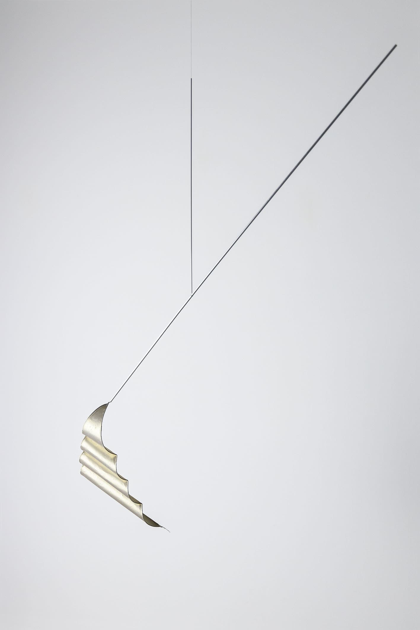針金で骨格を作り繊細であり強靭で柔軟な和紙を貼り合わせて造形物を作っています。今回の「波景(はけい)」展では空気や音の波動でゆっくり動くモビール、波板をモチーフにし規則的なかたちを用いて波の景色をかたちづくります。
