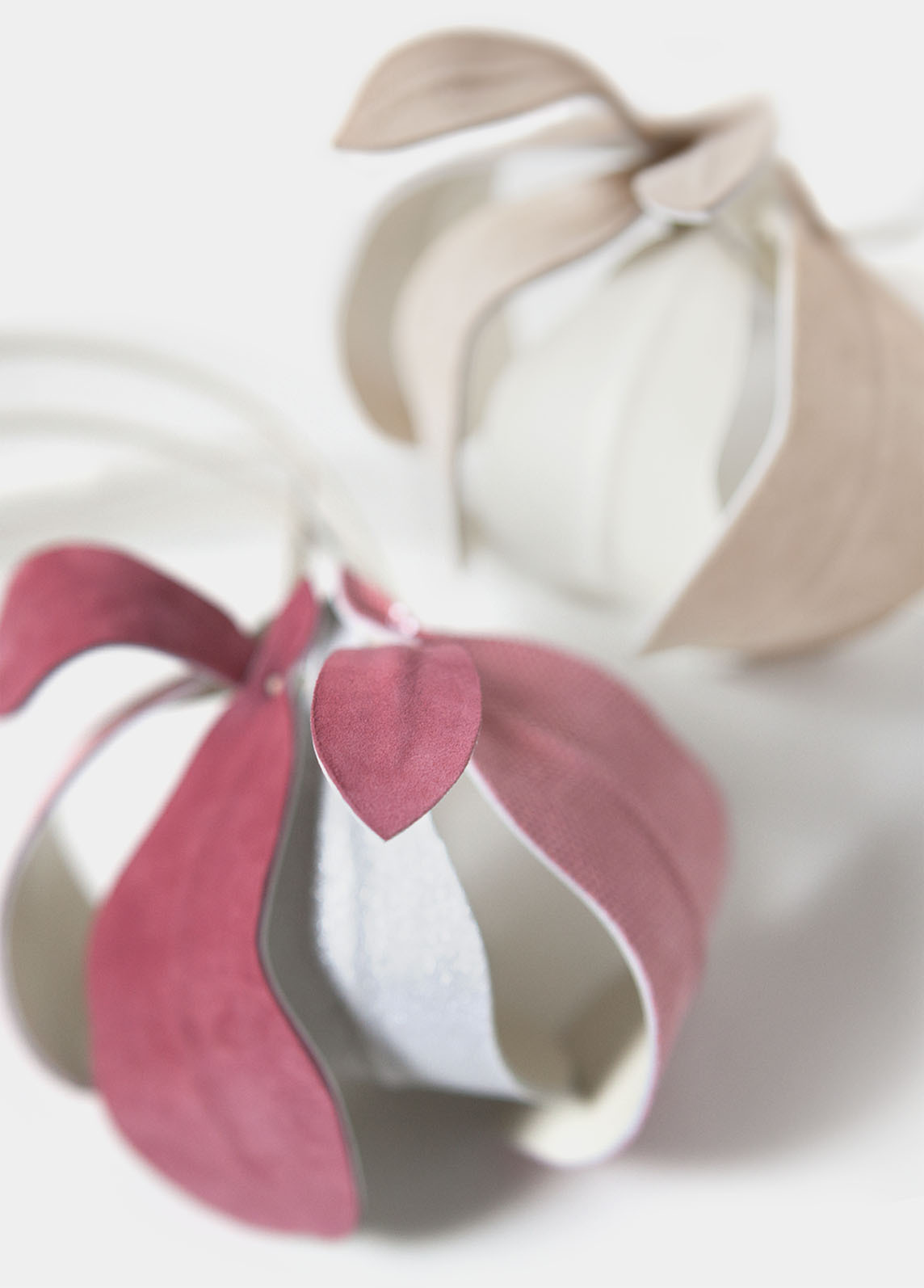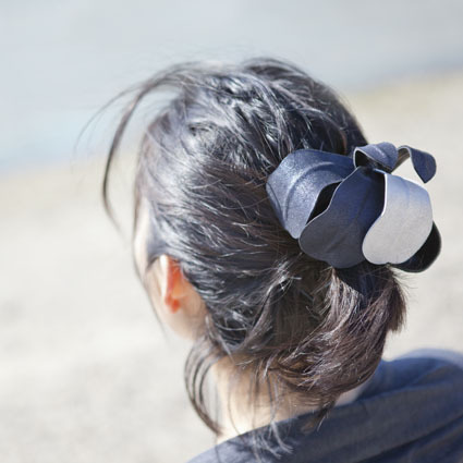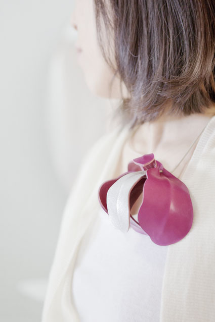毎年イタリアに買い付けに出かけ、上質で貴重な革をみずから仕入れています。その革を隅々まで使いたい思いから、革のアクセサリーを作り始めました。アイリスチョーカーは、上質な鞣し革で「花びら」の軽やかさと柔らかいフォルムを表現しています。紐の調整でチョーカー、コサージュ、髪飾りなどオリジナルな使い方ができます。