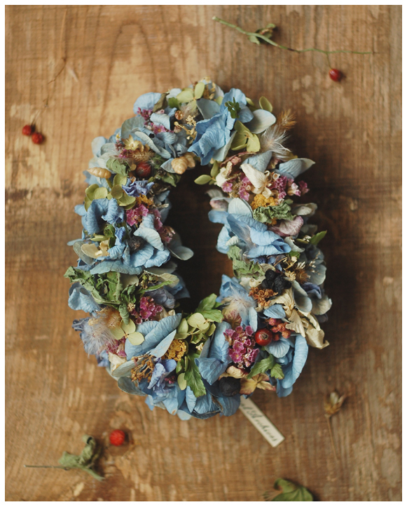 青色紫陽花とたくさんの草花や実のドライをつかう花環づくり。