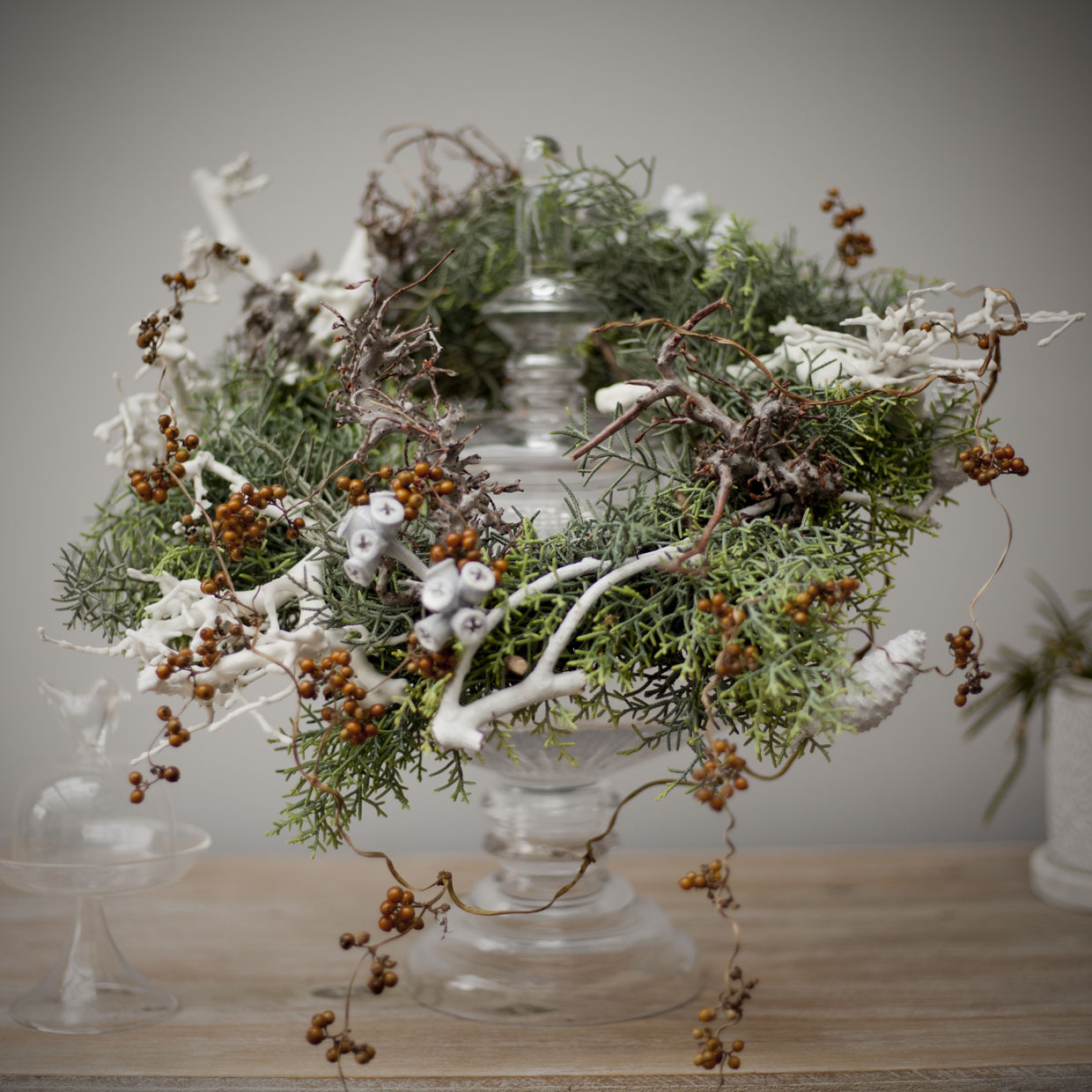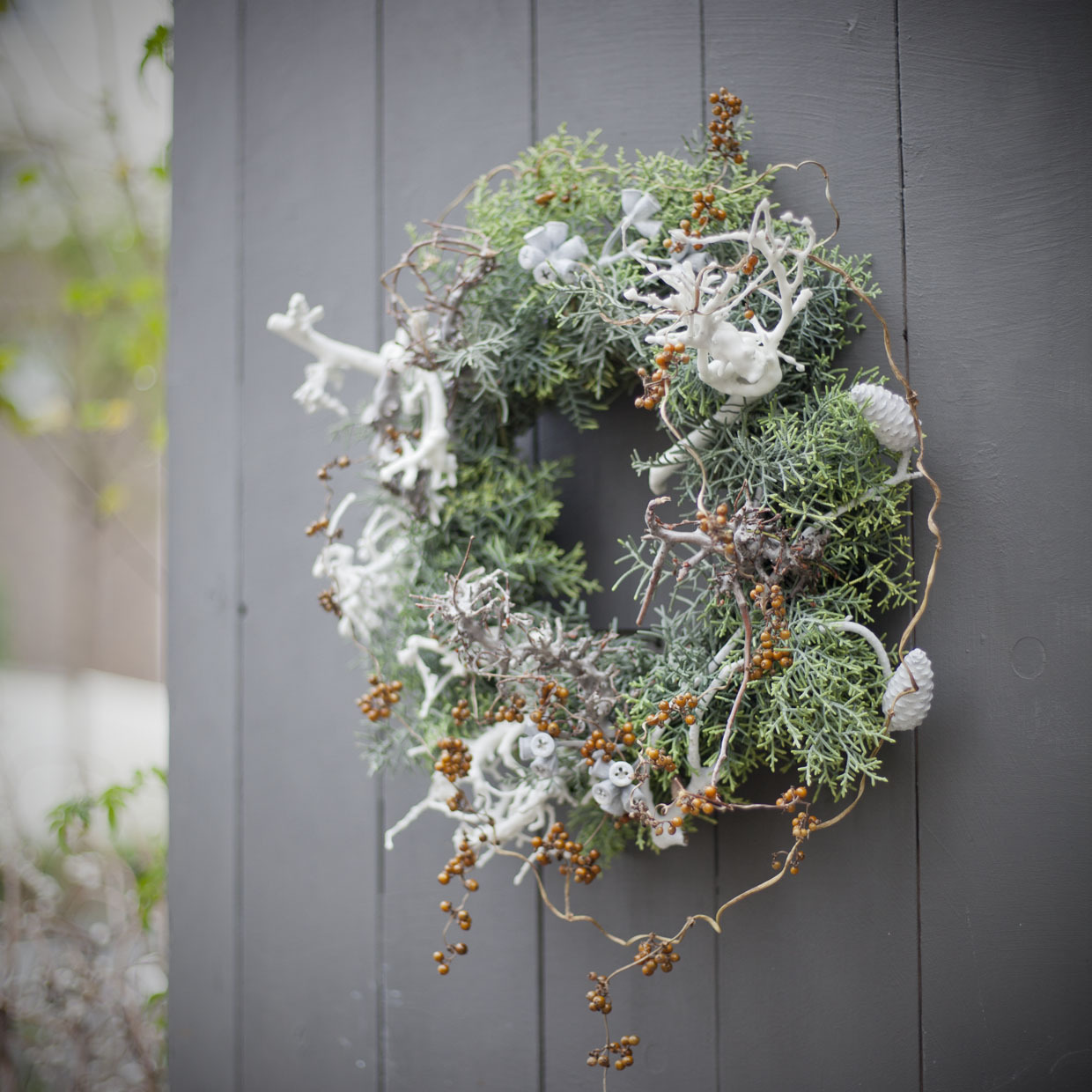 コニファー(針葉樹)のベースに、オランダから届いたばかりのAntique wax(木の枝や実に蝋をコーティングしたもの)などで飾ります。クリスマスから春まで飾って楽しめるリースです。
