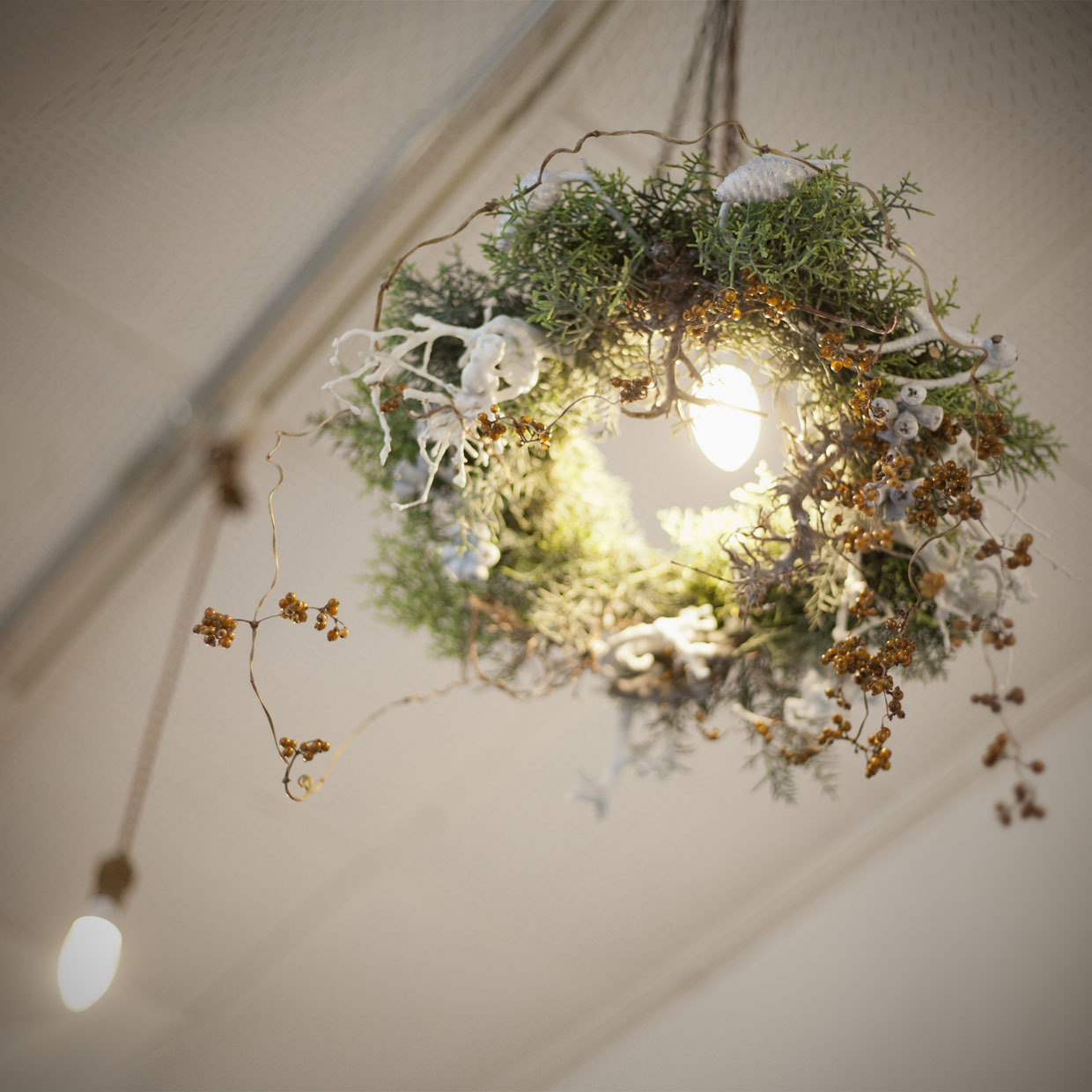フライングリースは天井から吊るして飾るリースです。吊るすだけでなく器の上に乗せてテーブルに置いたり、壁に掛けたりして楽しむこともできます。