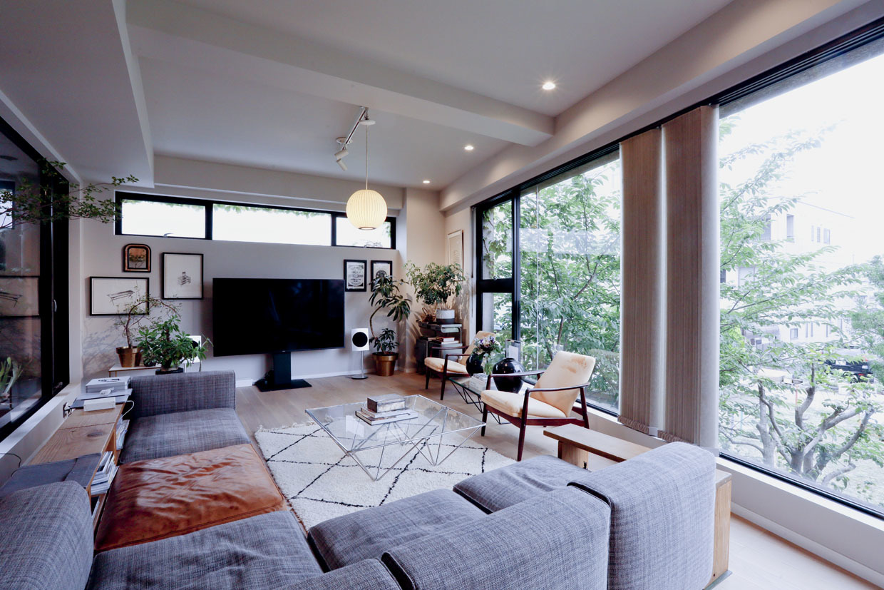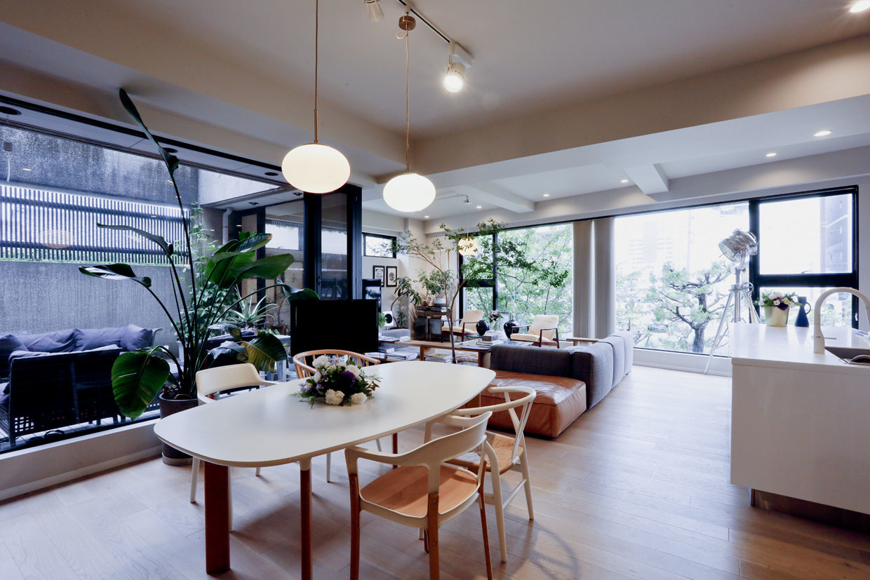 JR四日市駅から徒歩1分。RC3階建のビルをリノベーションした邸宅の2階部分。広い1LDKの大きな窓の向こうは公園です。