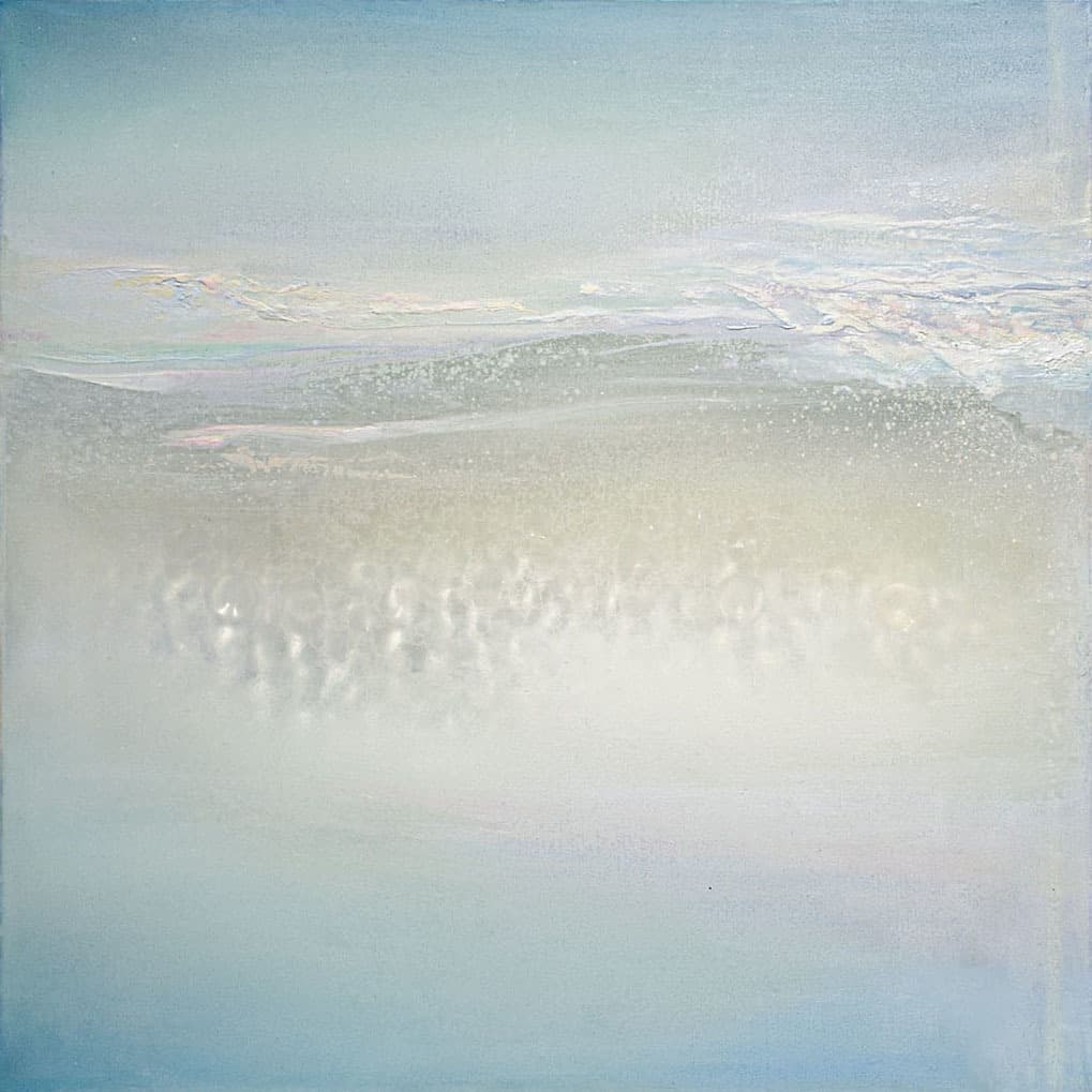 作品を描く時に思い出すふたつの感覚があります。ひとつは幼い頃に夜の海で泳いだ記憶です。夜になると空も海も判別できなくなり、闇しか無い恐怖のなかで、海面を意識しながら泳いだ時の感覚が、今の制作のテーマである平面性と物質の関わり方を創り出したのではないかと感じています。もうひとつは私が32歳の春、父が亡くなり荼毘に付され、白い煙となって空へ上っていくのを見送った時のことです。昔から形のないものを描きたいと思っていた私は父のその姿をみて雲のような大気のような存在を描きたかったのだと気が付き、難しいけれど今もそう思っています。