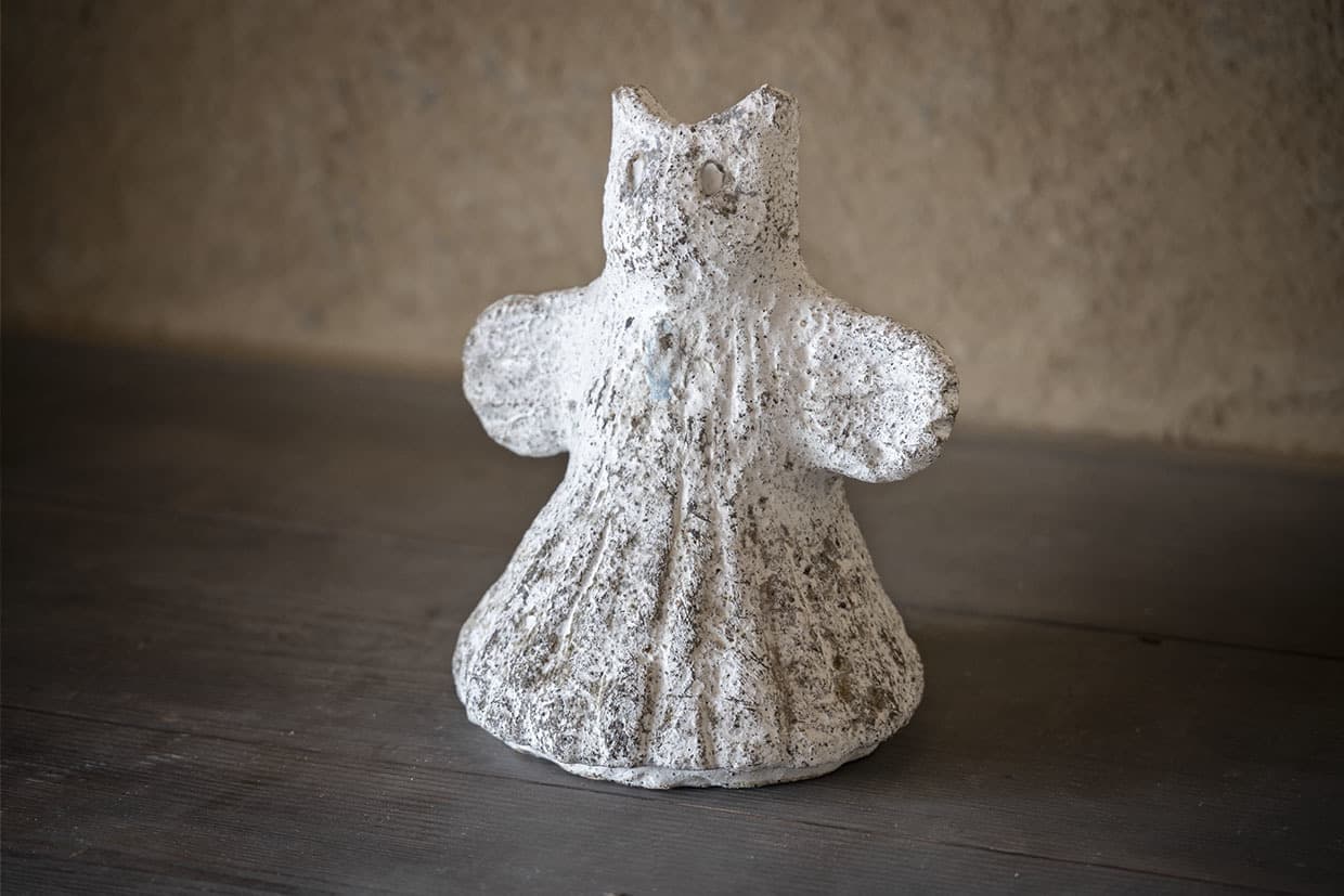 三重の美杉という、人の数よりきっと他のいきものの方が遥かに存在しているであろう、自然溢れる地に暮らしています。ここでは動物、植物、菌類、微生物をはじめ、目に見えない領域に暮らす生きものたちの存在を日々感じることができます。もちろん彼らと一定の距離はあるのですが、たまに種の境界を超えてお互いの領域が少し近づくように感じる時があるのです。その時の気配や感覚を形にしたく、今回のテーマを「Sprit Animal = 精霊」としました。素材も、ごく身近にある土や草などです。言葉を持たない存在と、同じ生命として向き合い意思疏通をしたいという思いは、私にとって「祈り」というものにもっとも近いのではないかと思います。少し間の抜けた彼らの姿に何かを感じていただけたら幸いです。