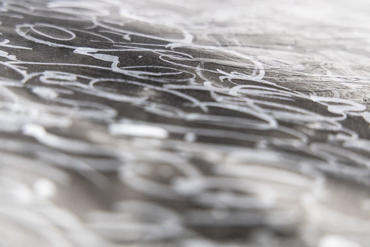 今回のテーマは、2022年にNoahと取り組んだ映像作品「Château Blanc」にインスパイアされています。その音と線の直感的な交差から感じ得たものを、紙の上に落とし込むという実験的な試みでもあります。自然の息遣い、とりわけ風や雲の音や影、質感、香りなど、心の赴くままに書き落としたその線のリズムや流れに身を任せていただけたら幸いです。